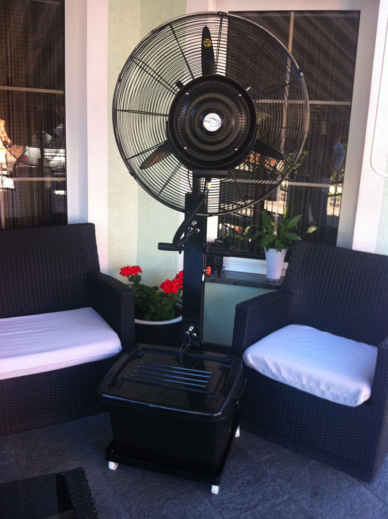 Ventilator s raspršivačem vode u vodenu maglu stvara potpuno prirodni osjećaj svježine u otvorenim i zatvorenim prostorima. Pogodan je za rashlađivanje terasa, ugostiteljskih objekata, sjenica, vrtova itd…